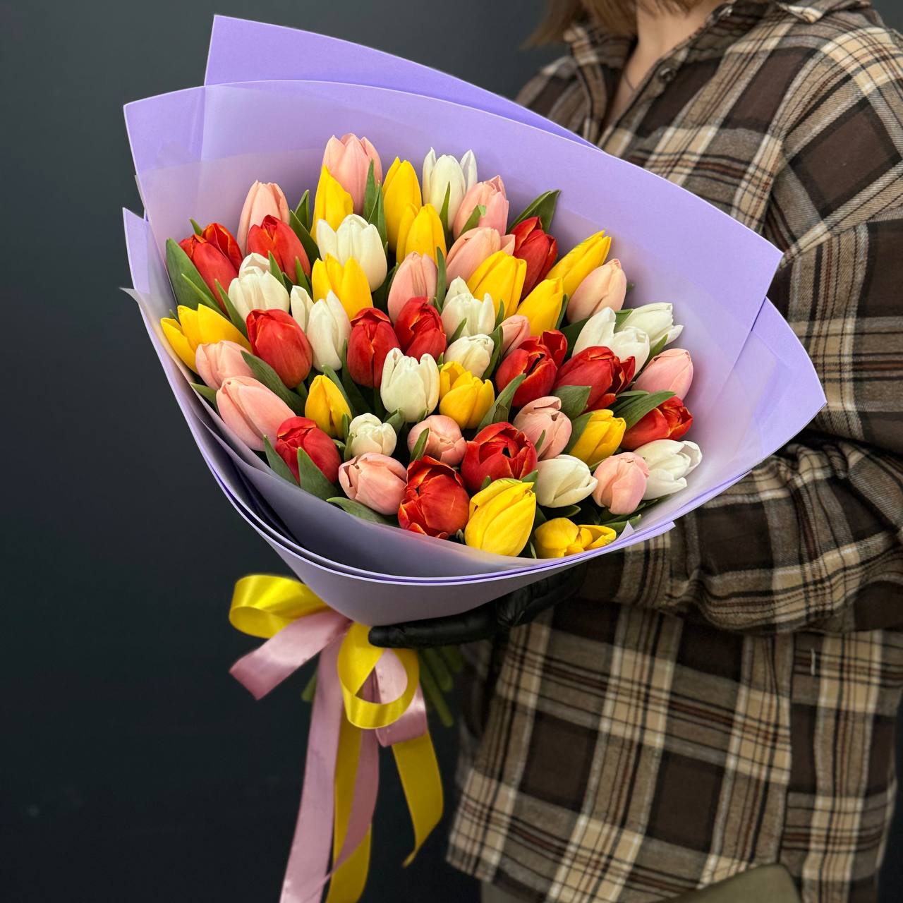 Букет из 51 тюльана, упакованный в дизайнерскую бумагу с атласной лентой. Роскошный подарок, если Вы идете на день рождения или юбилей. Хороший способ признаться в любви или напомнить о своей любви. Отличный букет для жены, для мамы, для любимой девушки.