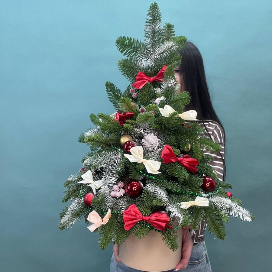 Современная елочка в красно-золотом исполнении. Нобилис, елочные шары, сухие фрукты, декор в кашпо. Размер S
