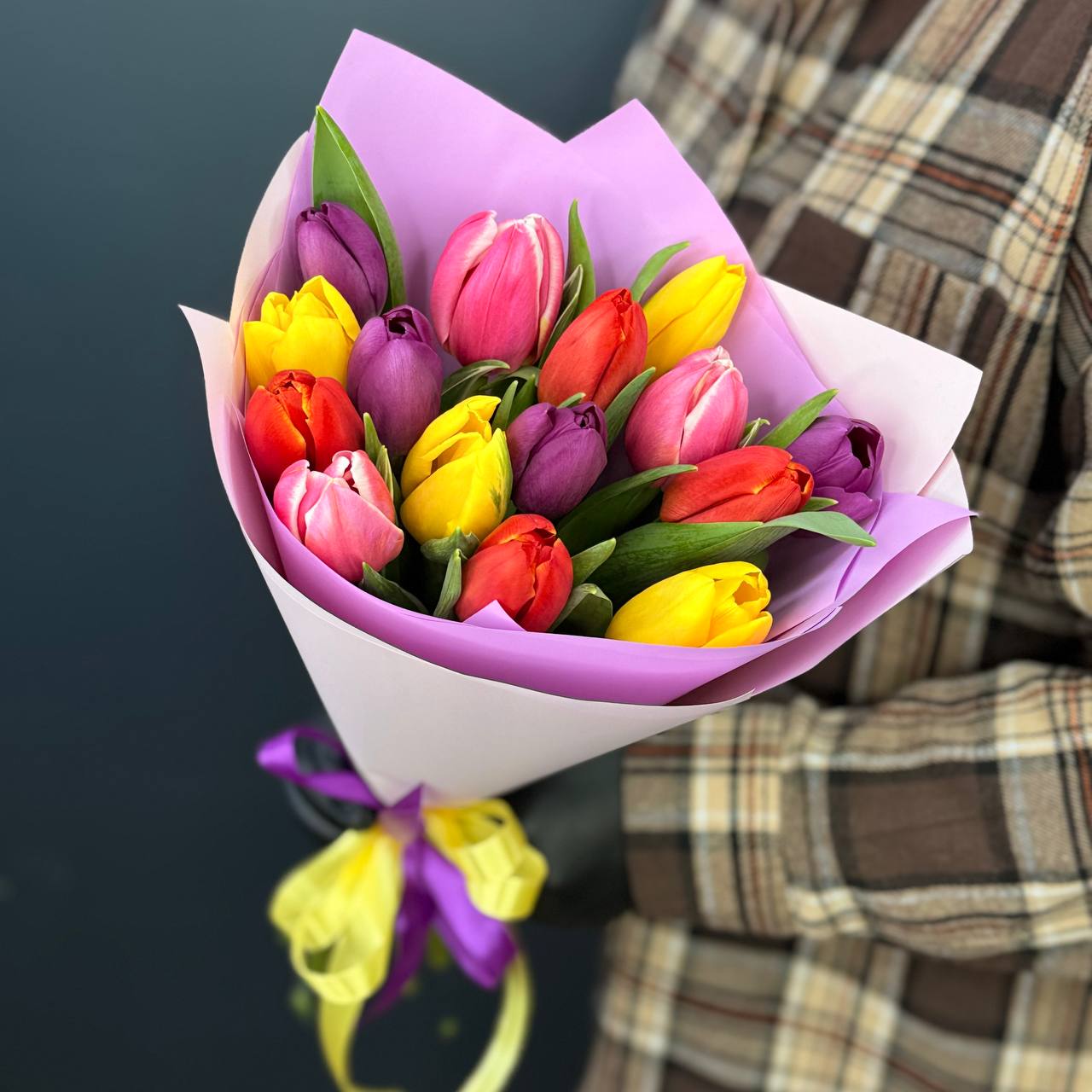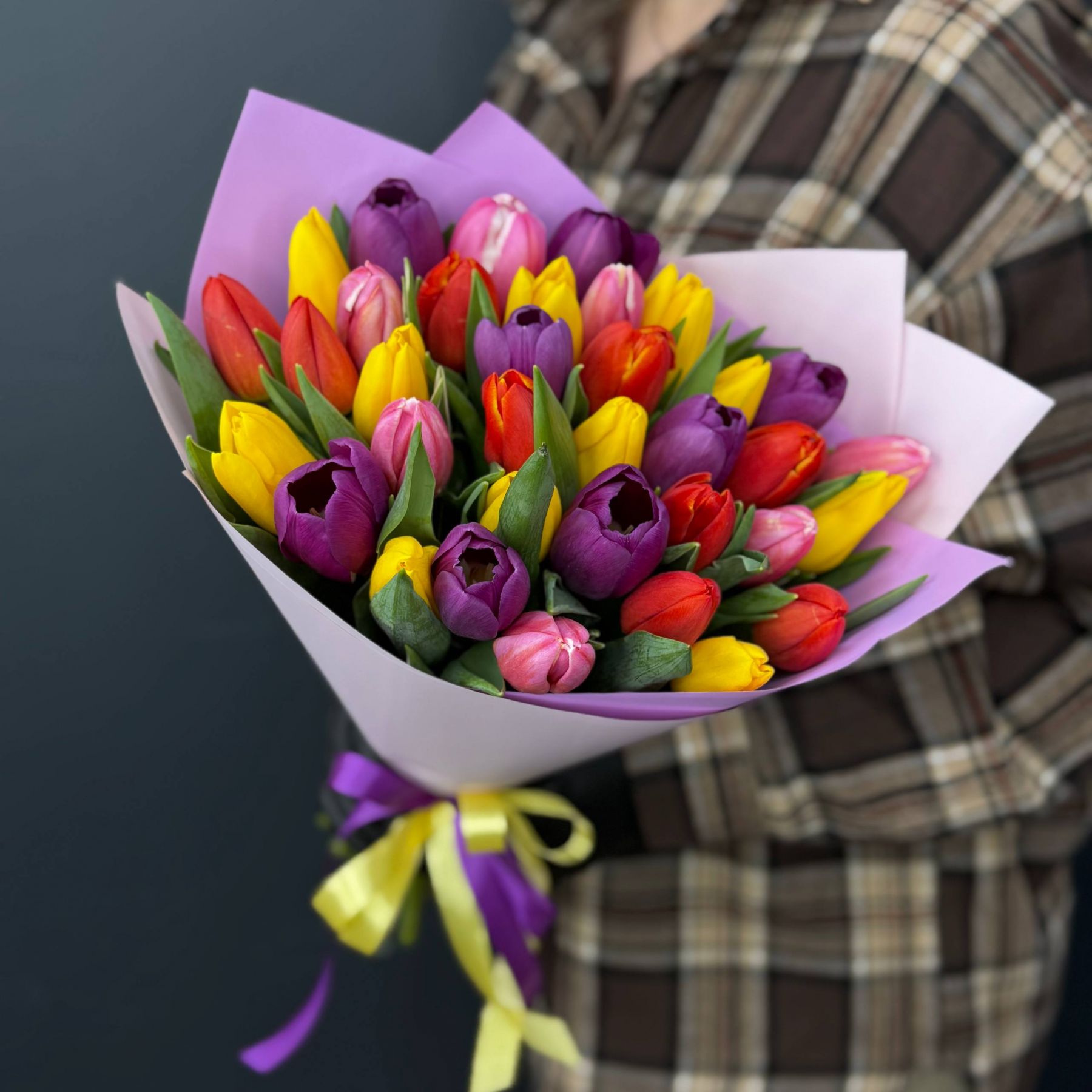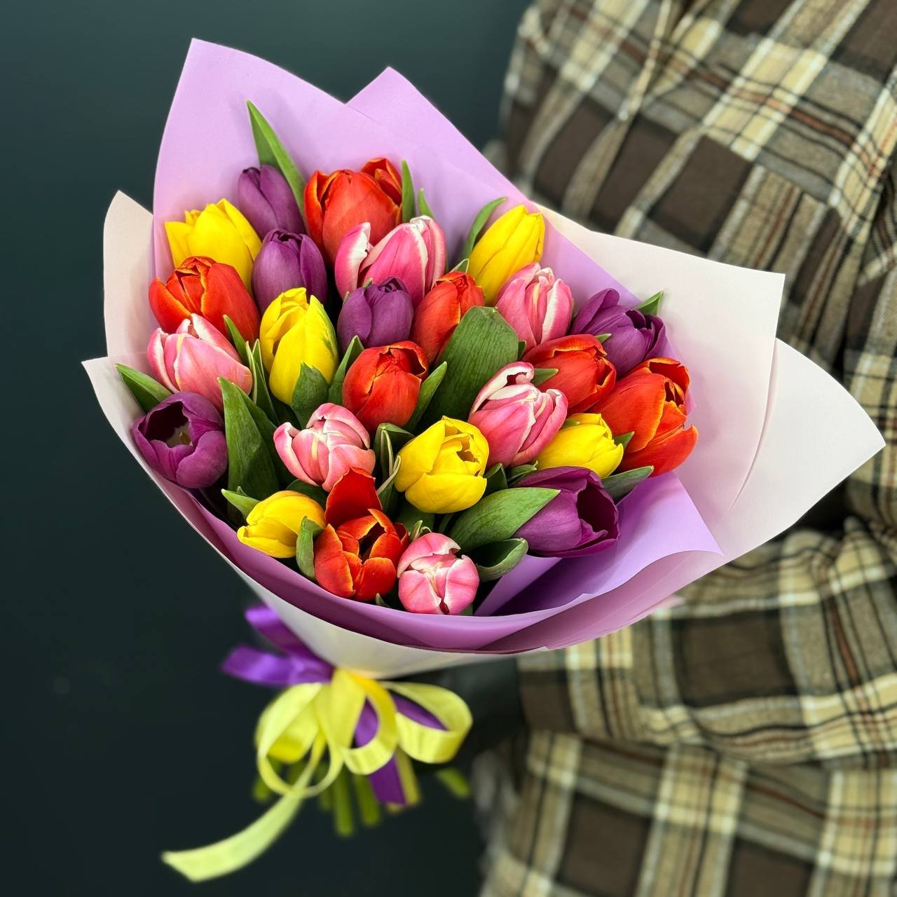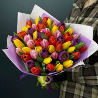 Красочный букет в составе тюльпан микс Голандия в упаковке с атласной лентой.